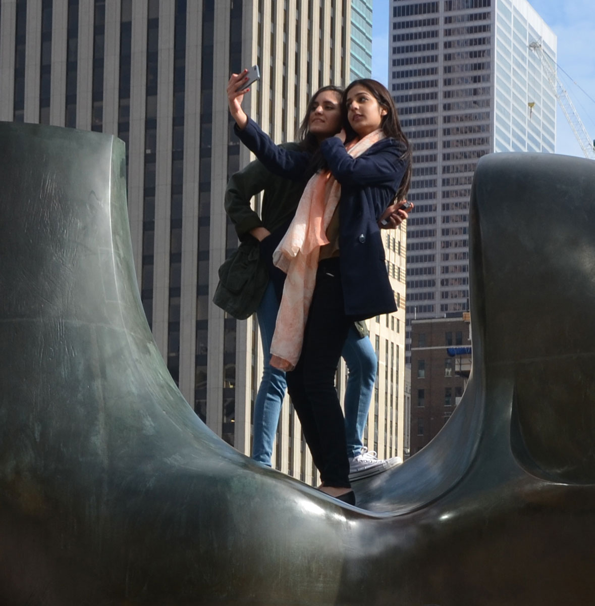 People taking selfies - two young women are on top of The Archer sculpture in Nathan Phillips Square. Downtown skyscrapers are in the background
