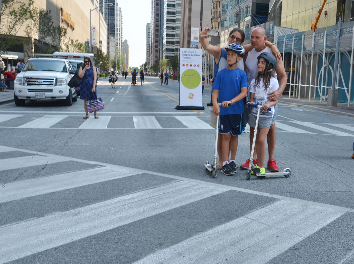 A family of four is in the intersection of Yonge and Bloor on the Sunday of Open Streets when the street was closed to traffic. The kids are on scooters.