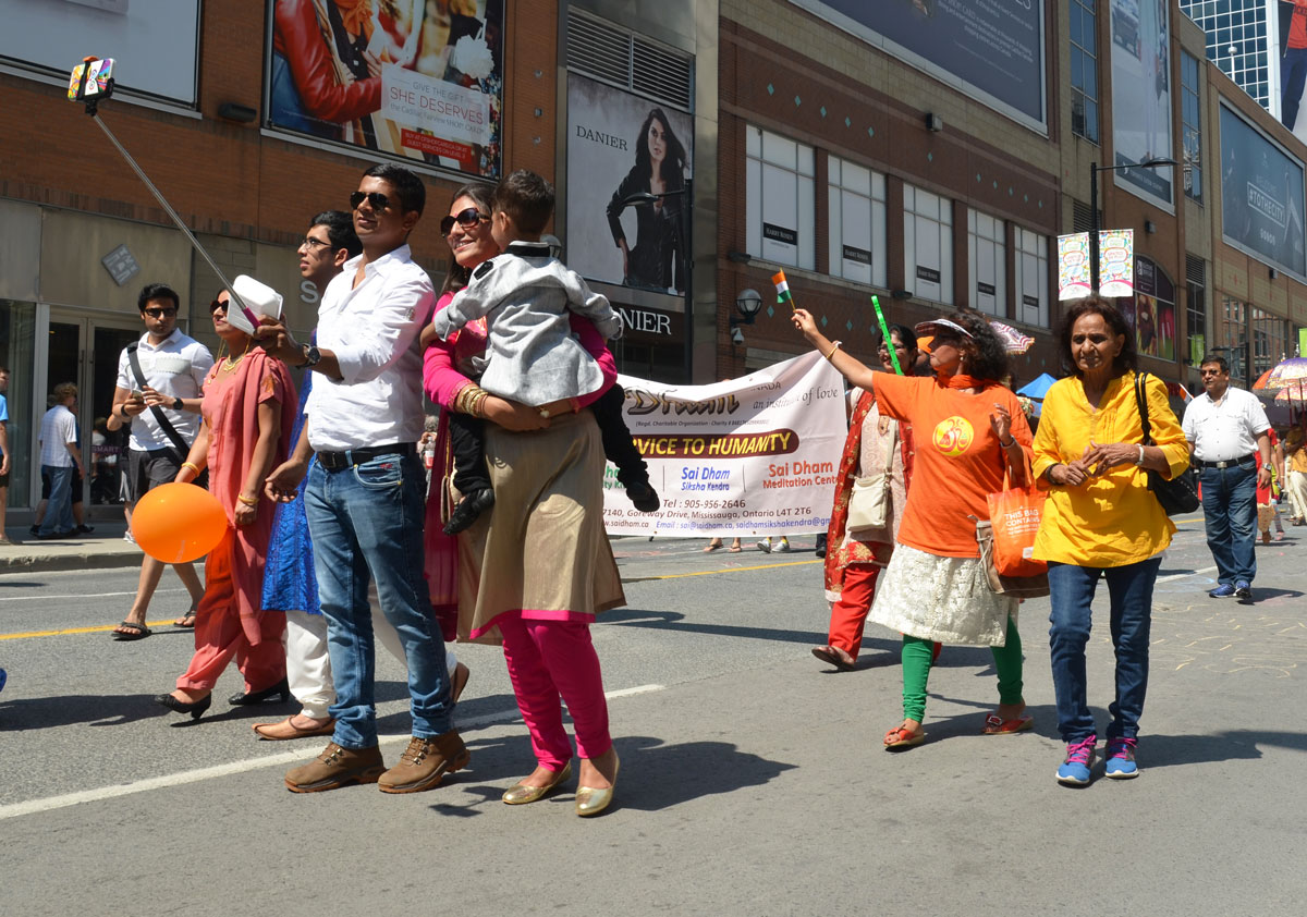 An Asian man (India heritage) is taking a picture of his family with a selfie stick as they walk in a parade down Yonge Street. His wife is holding a child. Other are walking behind them and holding a banner.