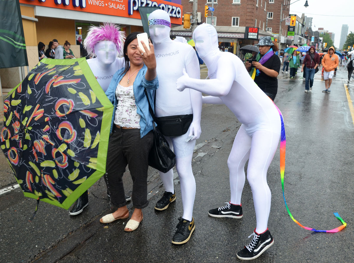 A woman with a brightly coloured umbrella is taking a selfie with three people at the Pride Parade in Toronto. The people are dressed from head to tow in white as part of an HIV awareness campaign, HIV is anonymous (and so are the people totally covered in white)