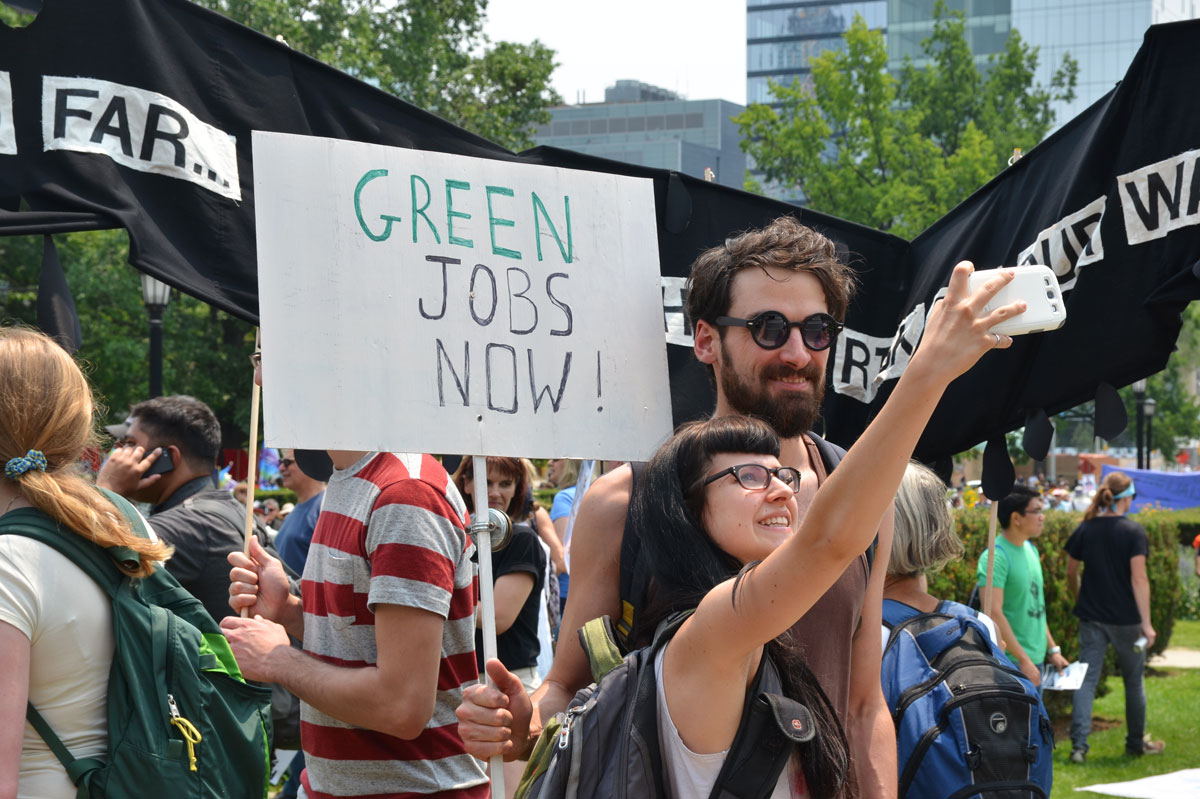 A couple is taking a selfie at a protest march. SOmeone is holding a sign that says Green Jobs Now behind them.