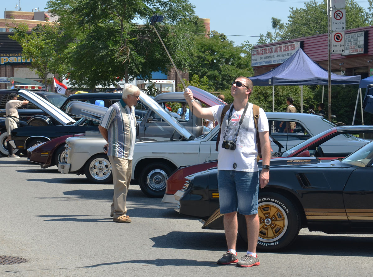 People taking selfies - a man with a selfie stick at a car show on the Danforth. He is standing in front of a row of cars with their front hoods up.