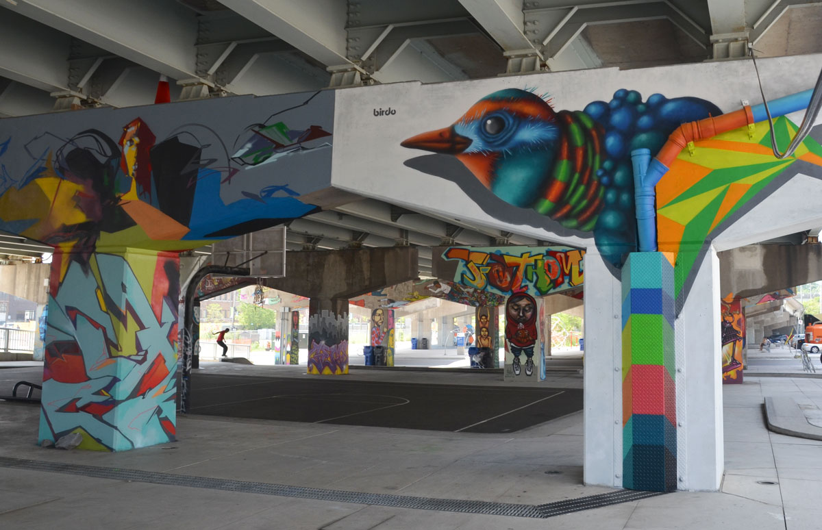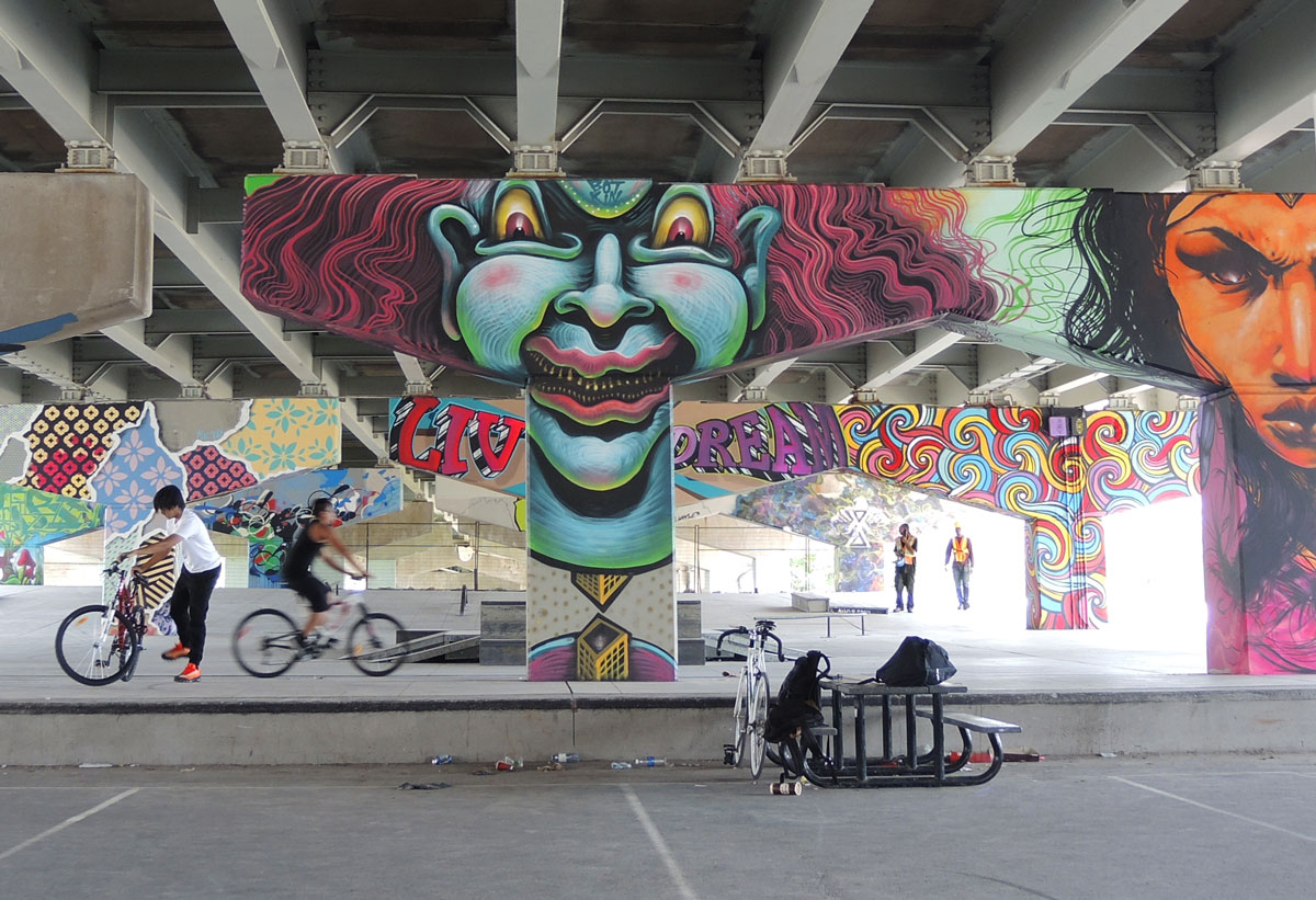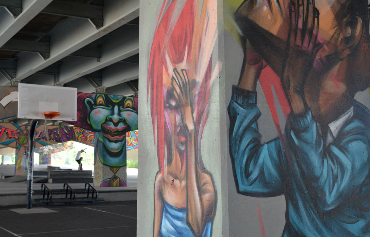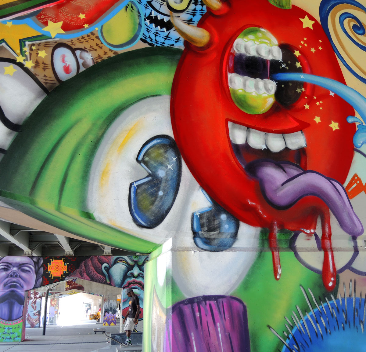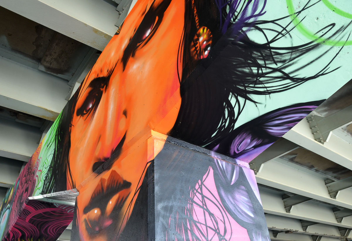 below: Up close to the central portion of a mural painted by Chief Ladybird and Auralast.