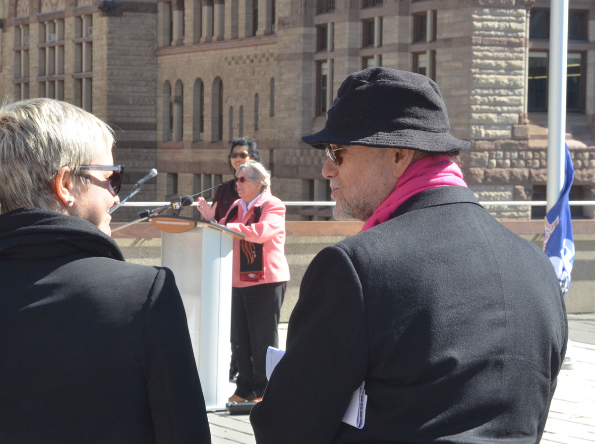 below: CARP president Moses Znaimer and a woman (my apologies for not knowing who it is) listen to a speech by Toronto city councillor Pam McConnell prior to raising the flag.