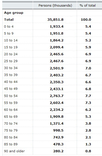 Just this week StatsCan announced that the number of Canadians older than 65 was more than the number of Canadians under 15. There were 5,780,900 Canadians 65 and older (16.1% of the population) compared to 5,749,400 who were under 15 years old (16%).