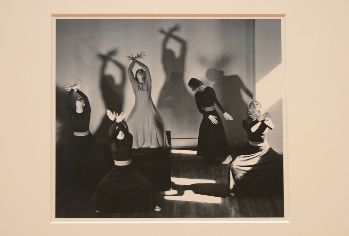 below: ‘Hanja Holm with dance group, New York’, around 1938, by Lotte Jacobi. Gelatin Silver print. The photo is actually sepia toned and not as ‘black and white’ as shown here. Hanja/Hanya Holm (1893-1992) was the stage name of a German born choreographer and dancer; she was Johanna Kuntze (nee Eckert) but considered her name “too heavy” for a dancer. She is also considered one of the founders of American modern dance.