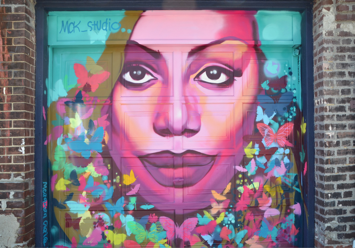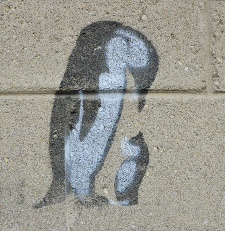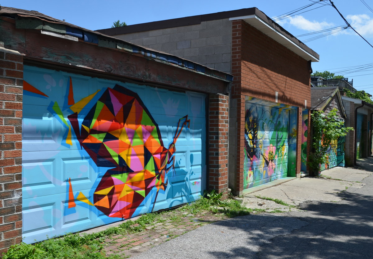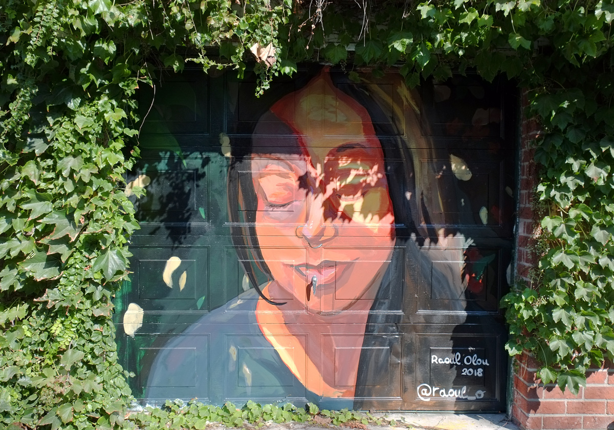 below: Uber 5000’s yellow bird is still walking his dog and singing a song on this side of this red brick building. It’s at least 10 years old? The black and grey portrait on the right is much newer.