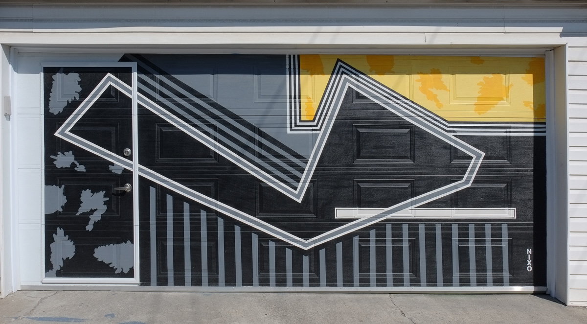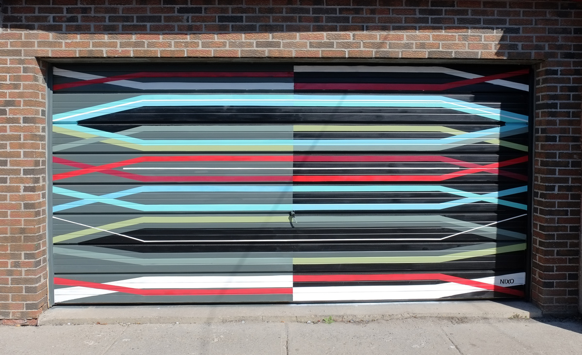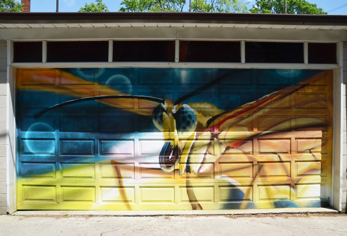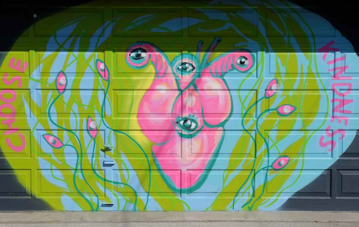 below: Uber 5000’s yellow bird is still walking his dog and singing a song on this side of this red brick building. It’s at least 10 years old? The black and grey portrait on the right is much newer.