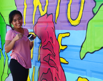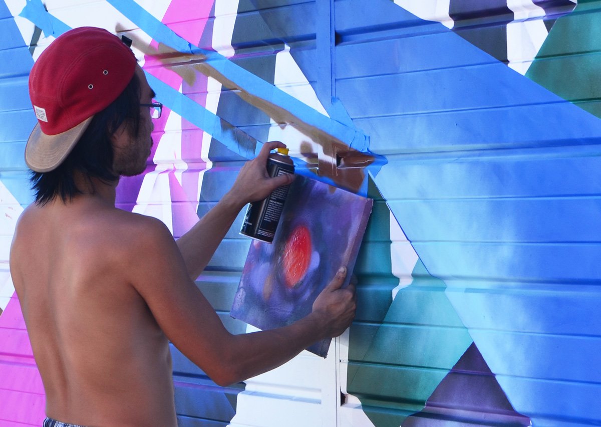 below: Sun of Aquarius (aka Andre Mandela Lopez) painted this naked figure with brown wings and bird mask