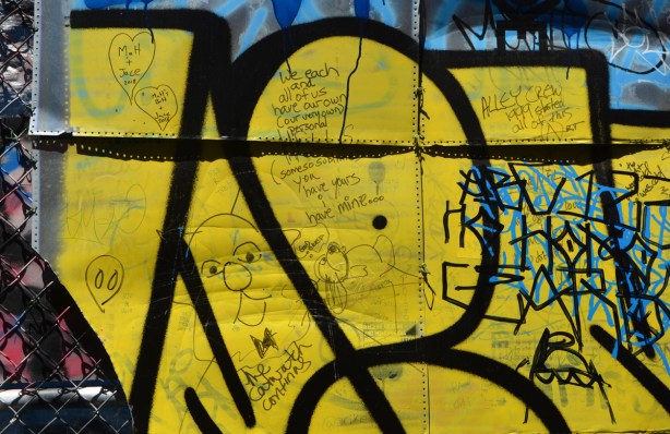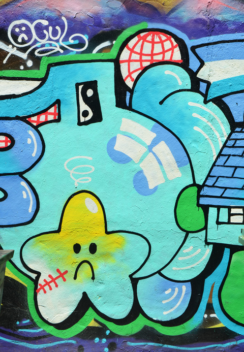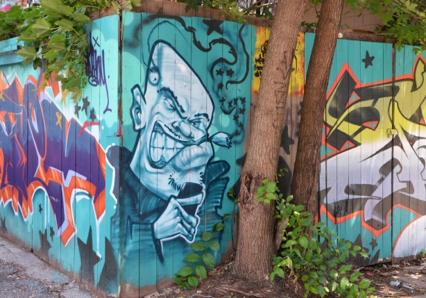 below: Like many empty buildings that are waiting to be demolished, the walls become a canvas for graffiti artists to take advantage of. Here, two identical faces with different tastes in drinks.