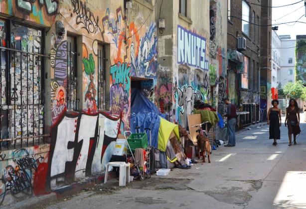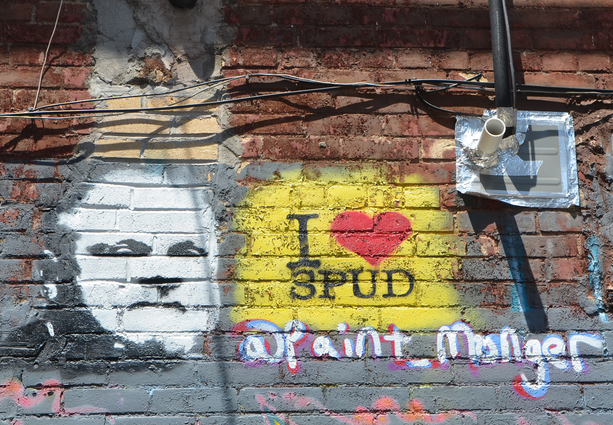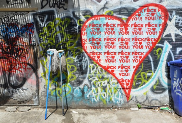 below: In a nearby alley, “Eat the rich”! The fork is provided.