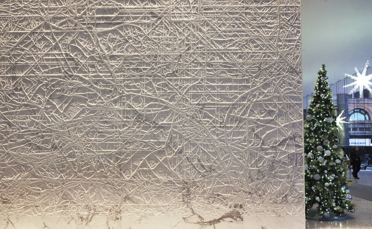 below: A marble wall with a bas-relief artwork by Nicolas Baier with the title, “Mappemonde”It was made by cutting way pieces of the marble, leaving a tree-like network that could be roots and branches or it could be more technical man-made communication infrastructure….