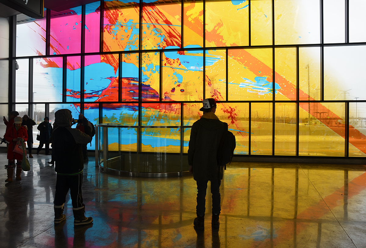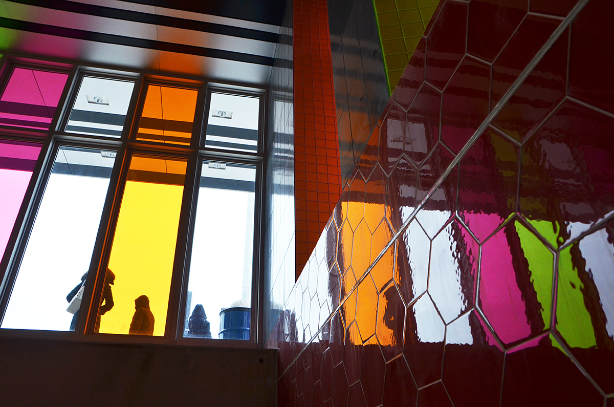 below: A large coloured glass window dominates the area at the top of the escalators (by the bus station) at Highway 407. This artwork is by David Pearl and is one of two pieces that he did for this station.