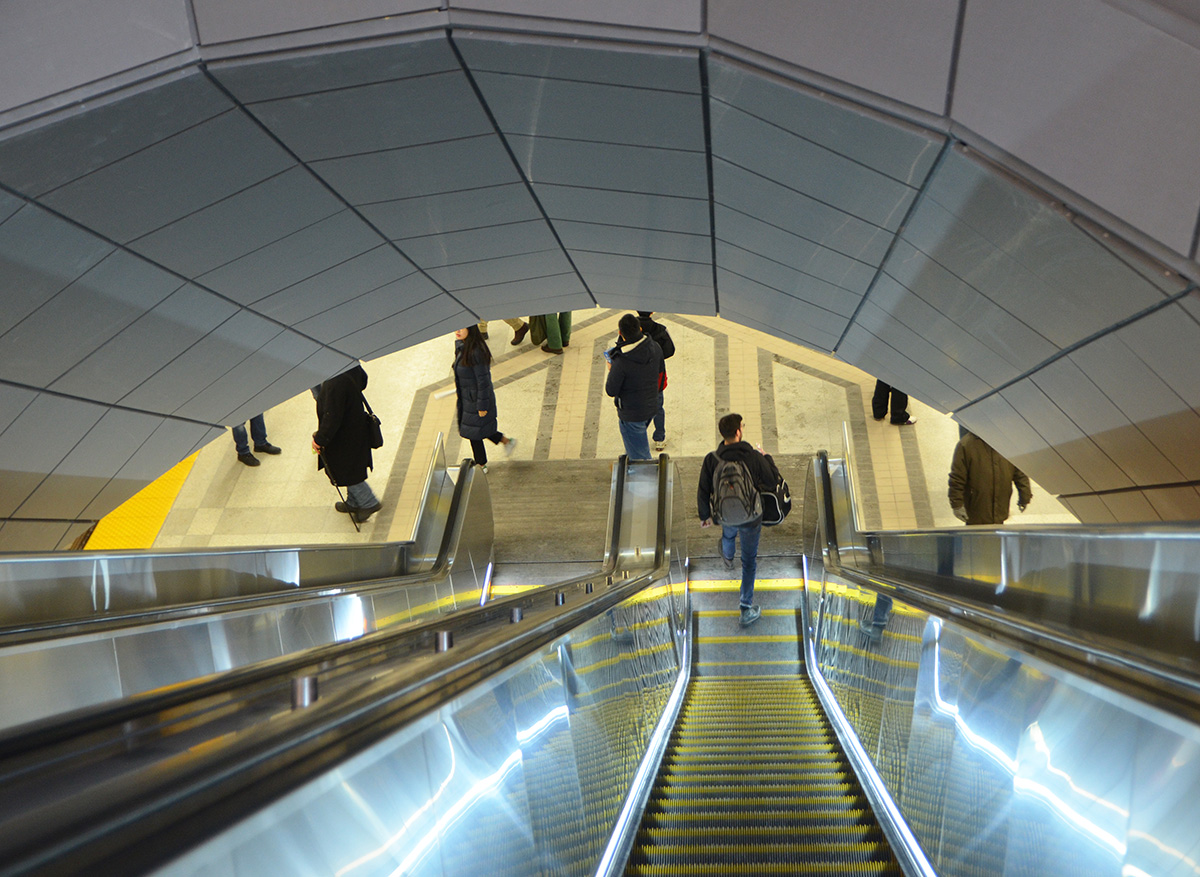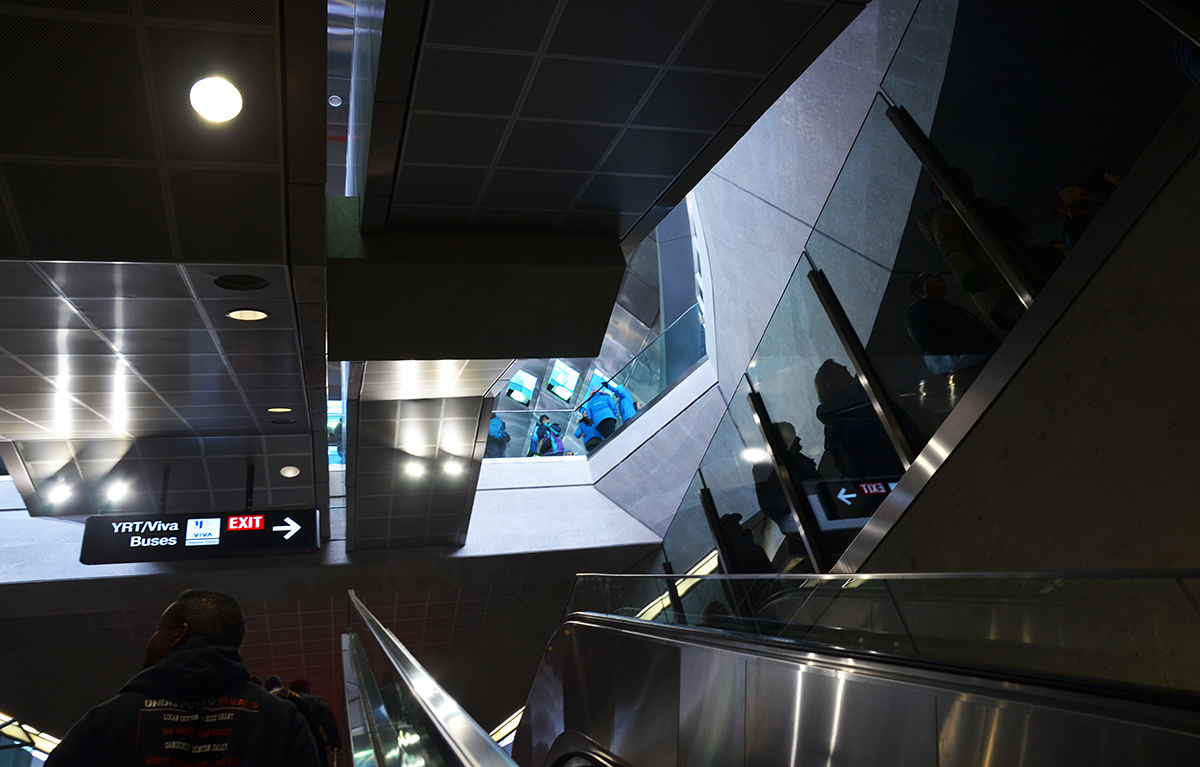below: Inside York University station which is right on campus. The stairs and escalators to the trains are in the center. On both ends of the curved structure are the exits.