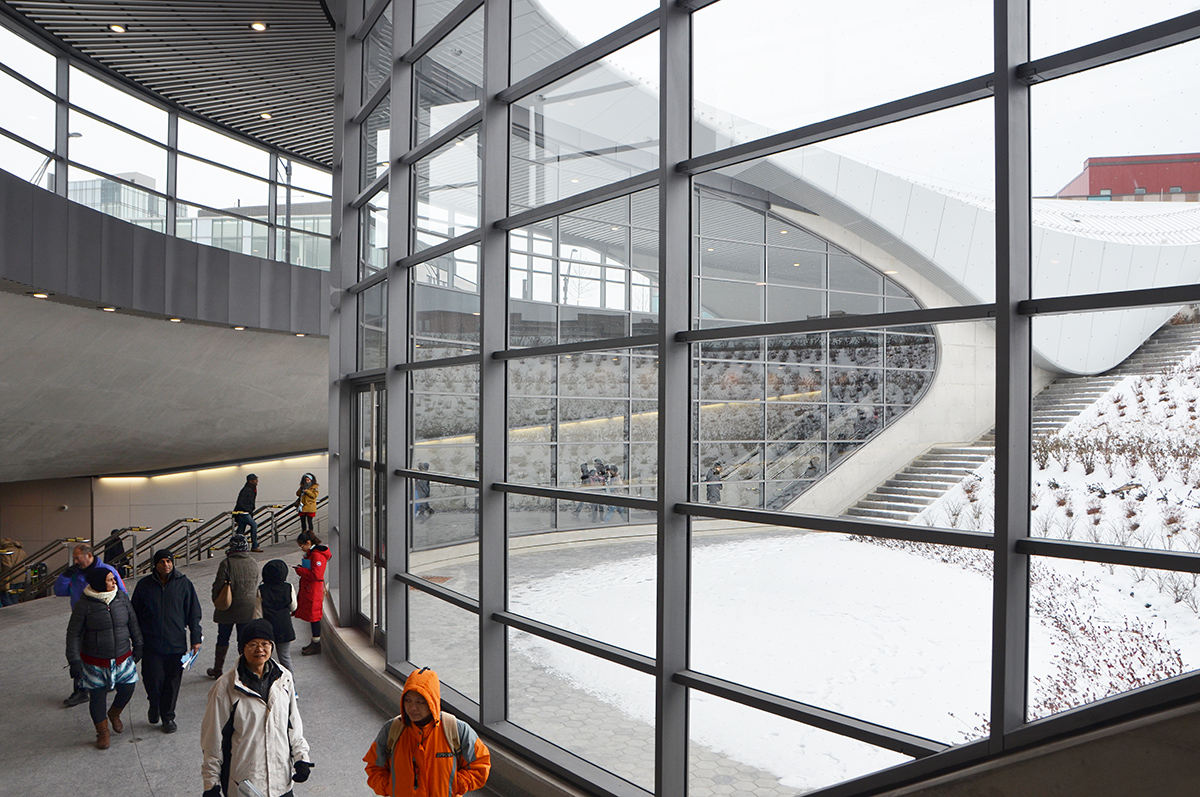 below: One of the entrances to Highway 407 – the center window is the same as the coloured window above (it looks much better from inside!). On either side are GO Transit bus terminals. Behind me when I took the photo is a large parking lot for about 600 cars. Functional but not necessarily pretty – it may look better from other angles but it was a cold day and it seemed like a long walk to get to the other sides).