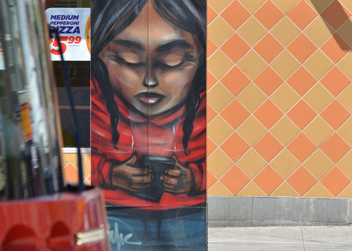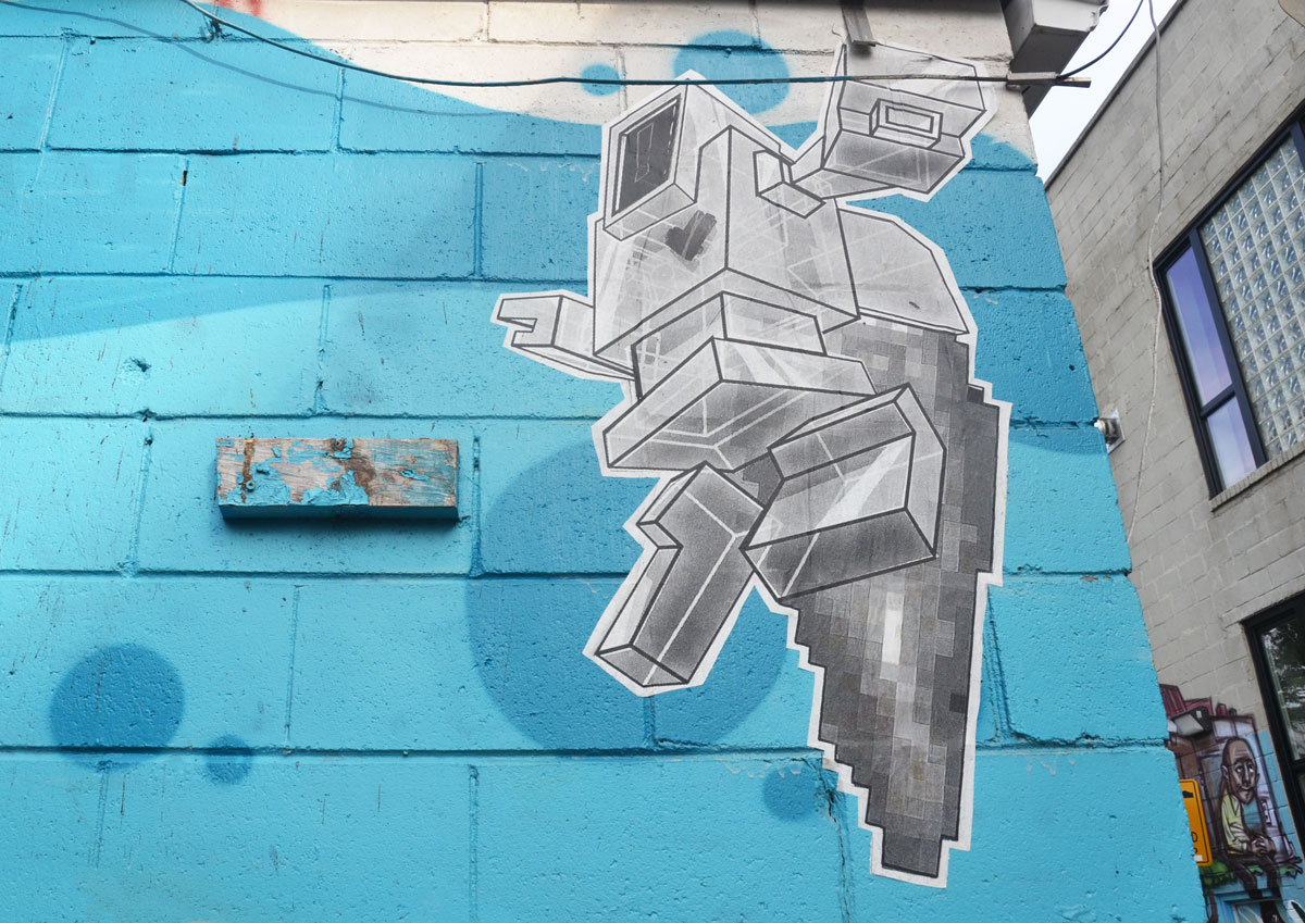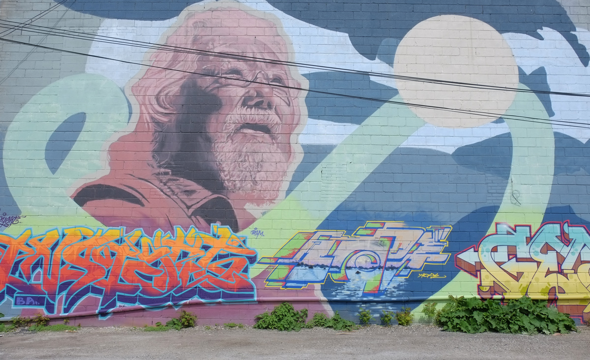 below: In the background, an untitled piece by Caratoes. It was one of 5 murals painted in Toronto in 2016 for the “Sea Walls: Artists for Oceans” series. In total, there were over 500 murals in 20 countries in this series.