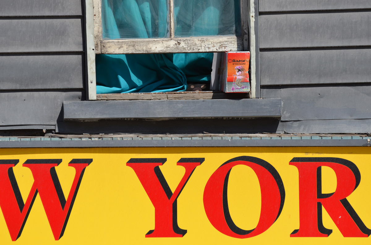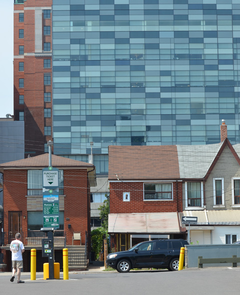 below: Looking south. The closest garage on the right has a mural painted by Spud.