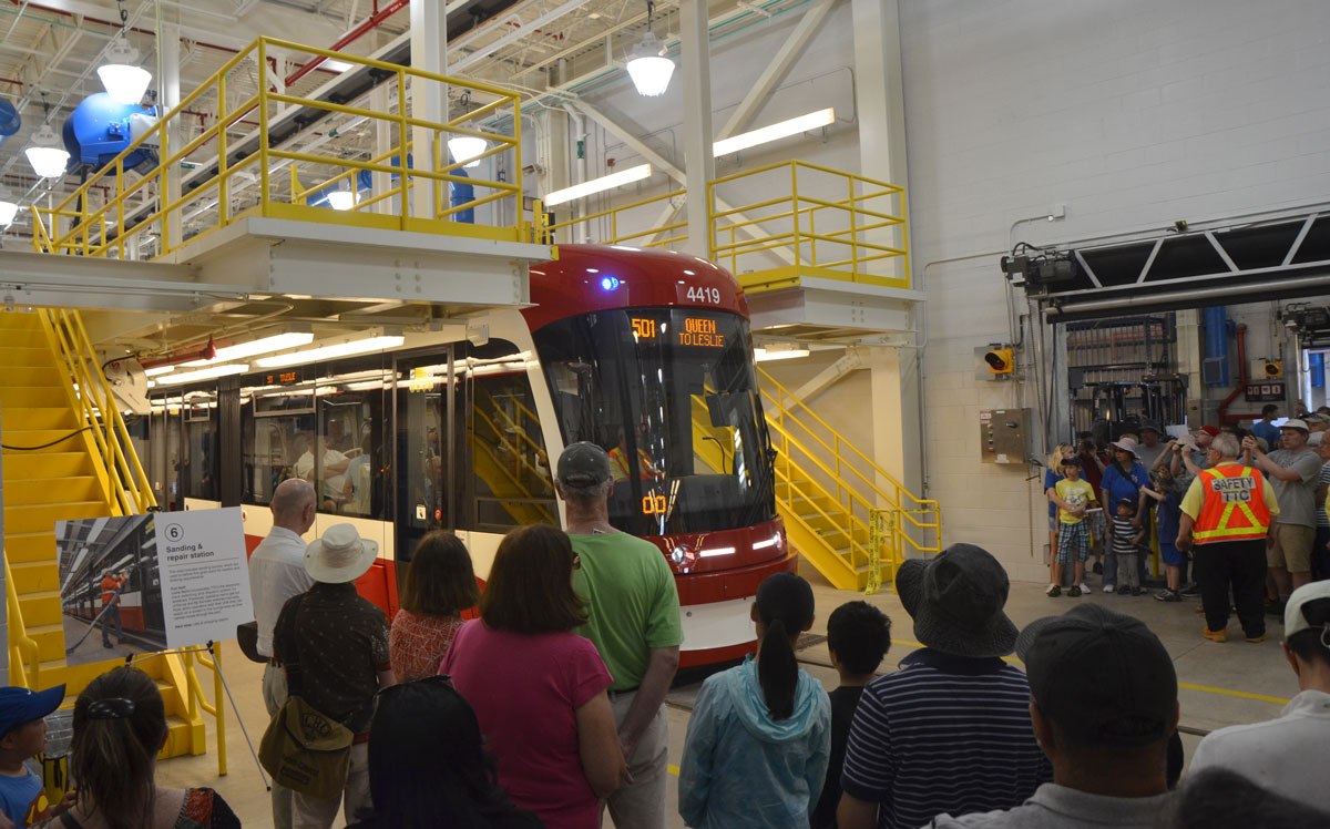 As you all know, the TTC is replacing their older streetcars with new longer Bombardier streetcars. Or at least they are trying to 🙂 Because they are longer, they don’t fit into existing “garages”, hence the new Leslie Barns facility. Located on Leslie St., south of Queen, it is the new streetcar “home”. It is where streetcars are parked, maintained and repaired. It has been in operation since Nov 2015 but the first chance the public got to peak inside the finished complex was at Doors Open on the 28th of May.