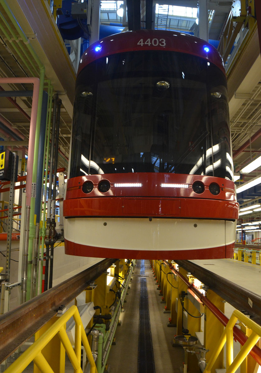 below: Special bays have been constructed with space for workers to access both the underneath and the top of the streetcars. Because the cars have been designed to ride low, a lot of their workings such as the HVAC and propulsion systems are built into the roof of the car.