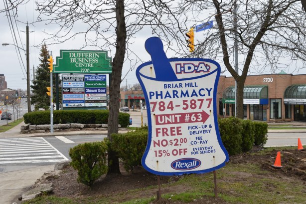 below: Because of the angle from which this photo was taken, the exact locations are slightly unclear. The Medical Clinic is 4651 Sheppard East. To the west of that is a vacant lot that used to be a gas station and it is on the SE corner of McCowan and Sheppard; it is in the process of being redeveloped. The apartment building is actually on the SWt corner of McCowan and Sheppard.