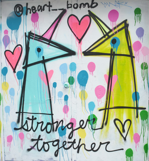 below: Love not hate. A blue raccoon stealthily walks across a roof above a mural that was painted by participants in this year’s Girls Mural Camp (a three week program in the summer for teenage girls).