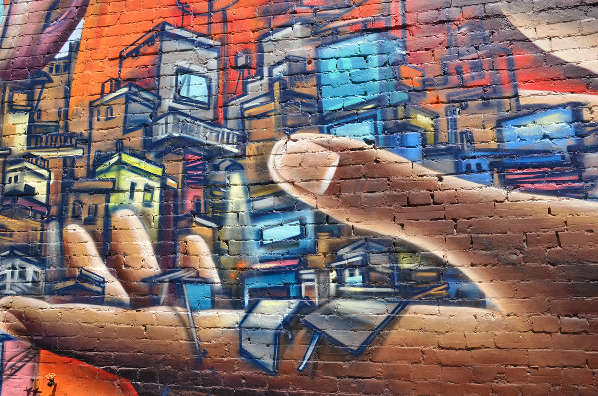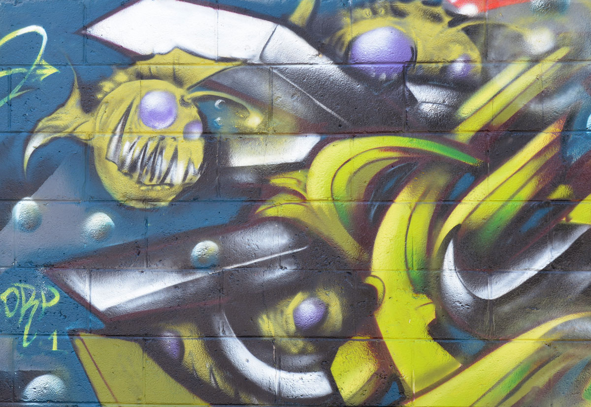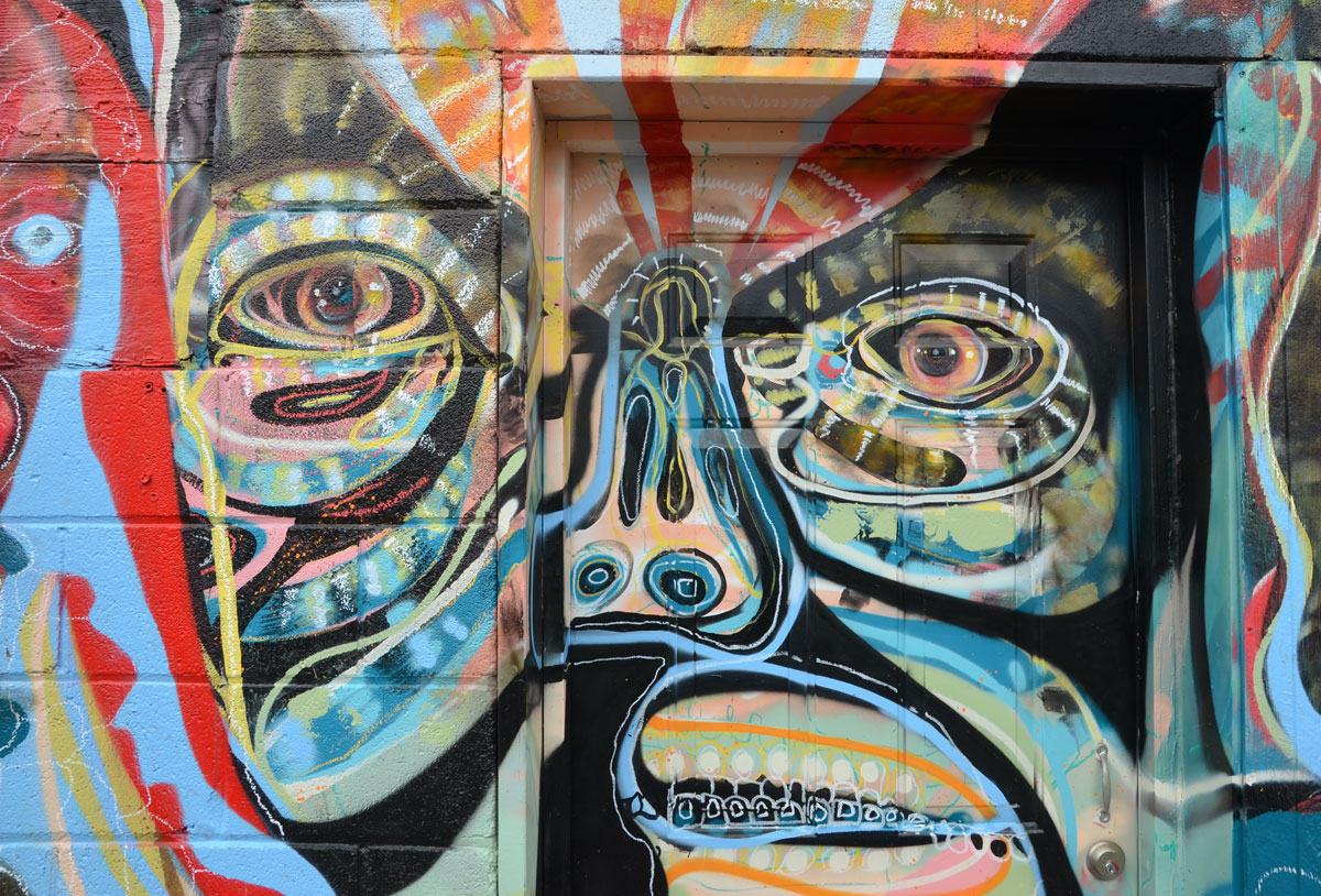 below: Toothy grins and googly eyes, coloured monster faces all squished together to completely cover the back of this building. It is the work of monicaonthemoon.