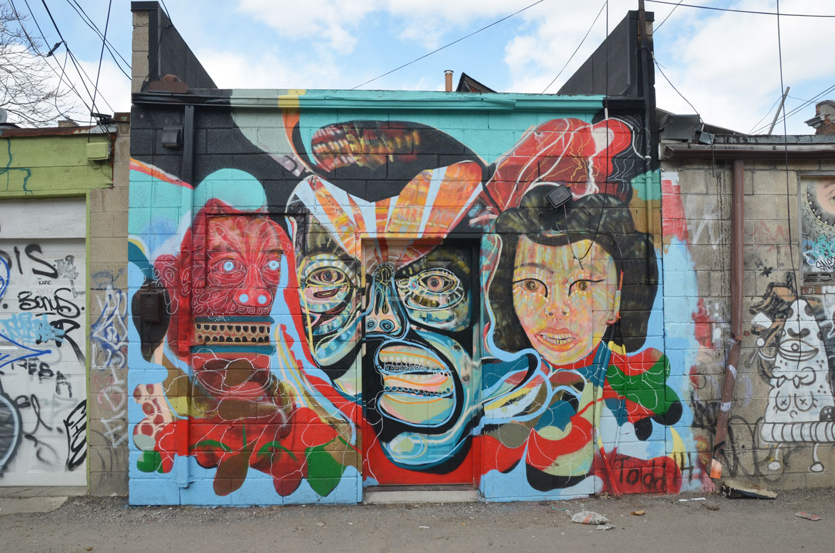 Today’s blog features Paul Estrela Lane which runs for one block on the northside of the Danforth ending at Woodbine Avenue. Some of the garages and fences have been painted with bright and cheerful murals. There are quite a few paintings considering the fact that the lane is only one block long. Here they are…..