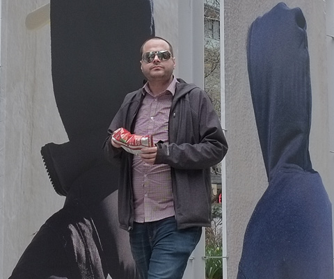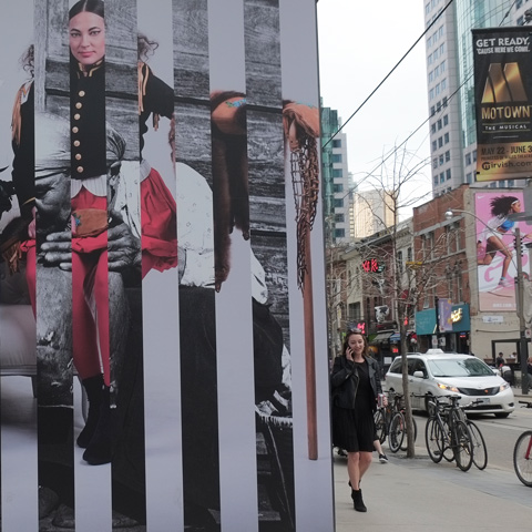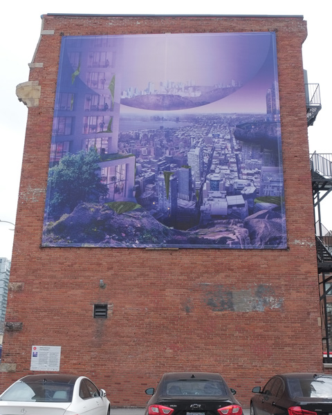 below: The Shangri-La hotel and Momofuko restaurant with it’s weird sculpture “Rising” by Zhang Huan at street level (also University Ave). Masses of “peace pigeons” cover the surface.