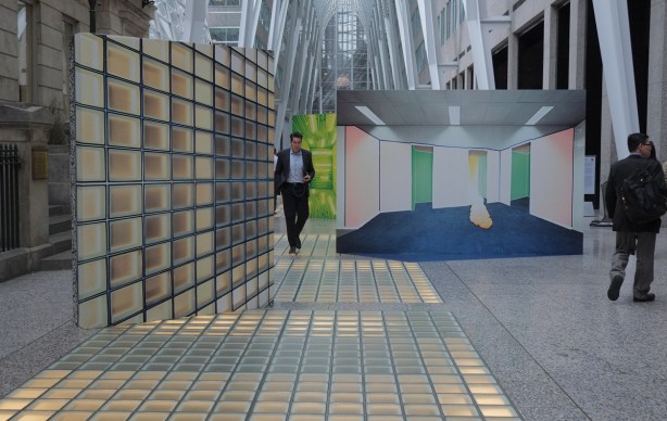 below: Roy Thomson Hall in the foreground with downtown buildings in the background, as seen from Metro Hall.
