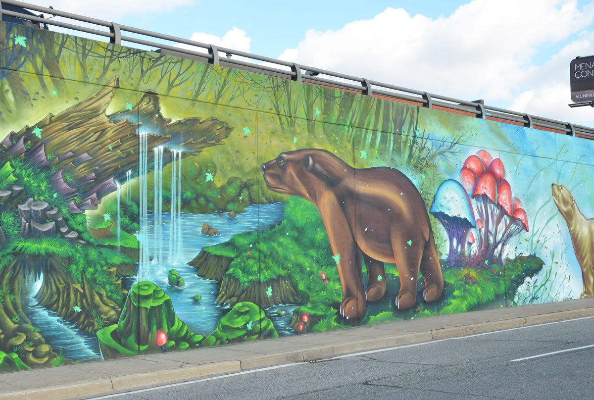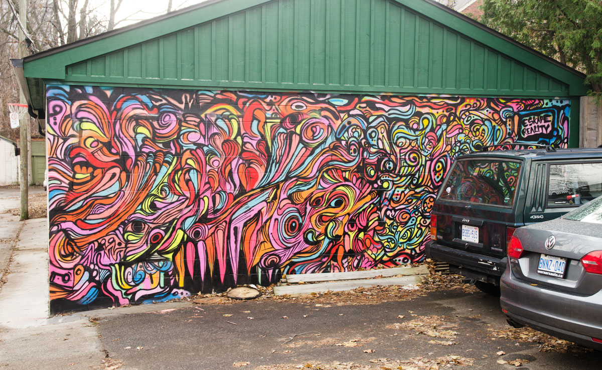 “In this work, she recreates the same text a well as advertisements ranging from the refrigerators to beedies (a type of Indian cigarette). Images of tigers, paint swatches, and her ubiquitous flowers are peppered throughout. In some of the billboards, Dhaliwal depicts Hindi script. Unable to read Hindi herself, she wrote the letters backwards. When this was pointed out to her, she decided to write one of the English language billboards in reverse as well.”