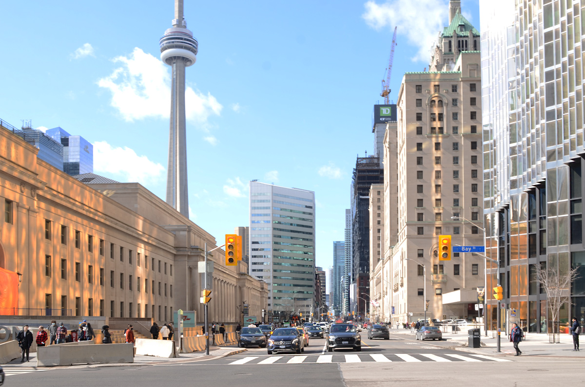 below: Looking west on Front Street from Bay with Union Station, CN Tower, Royal Bank building, and the Royal York Hotel.