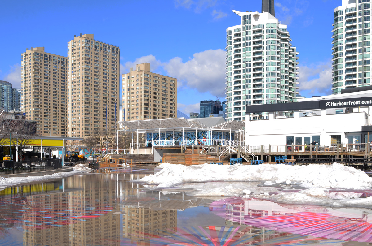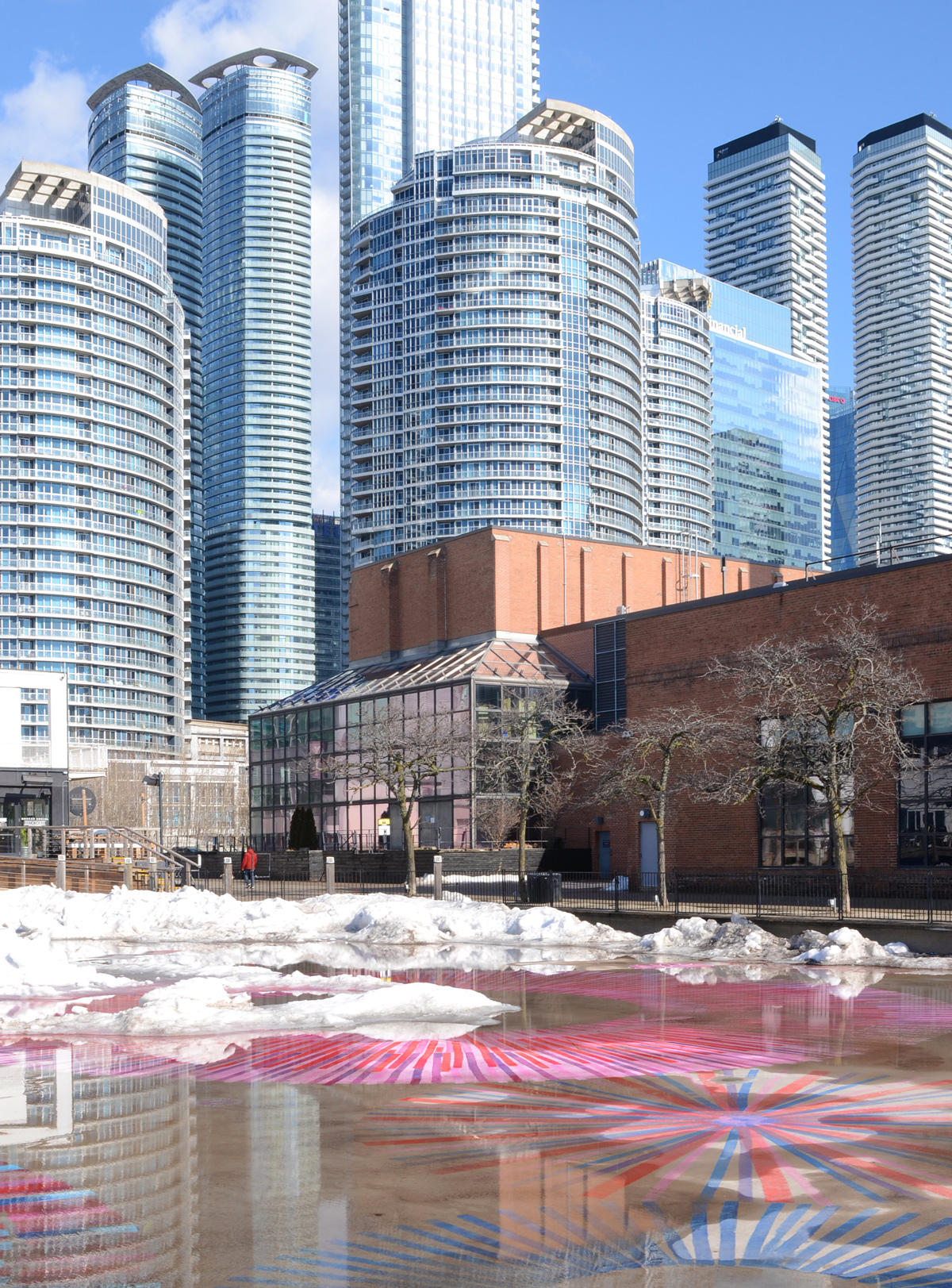 below: The skating rink beside the Power Plant is melting quickly. The designs painted on the concrete below provide a bright contrast to the towers of glass and steel nearby.