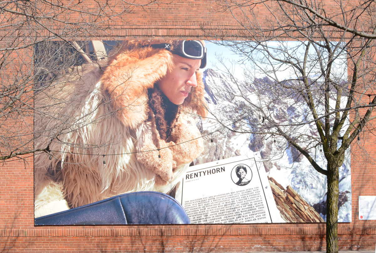 below: On the south wall of The Power Plant, a large image of the artist, Sasha Huber, on top of a Swiss mountain.