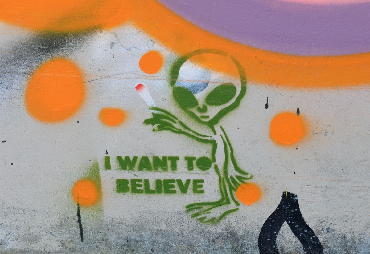 graffiti on the concrete supports under a bridge - stencil of a little green alien and the words, "I want to believe"