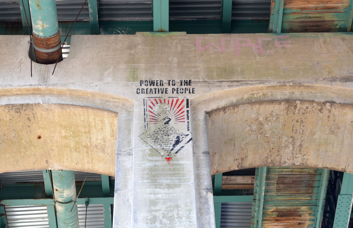 graffiti on the concrete supports under a bridge - words 'power to the creative people"