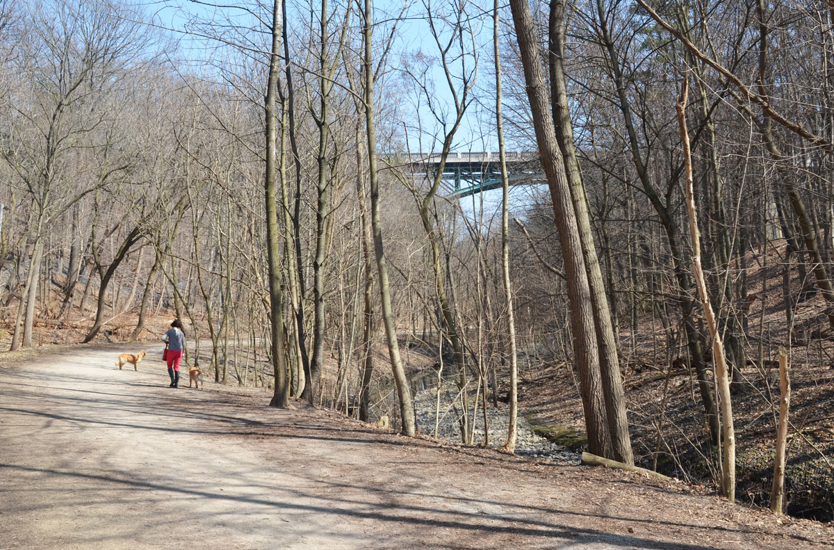 trail beside a creek in a ravine with lots of trees in early spring before there are any leaves on the trees.  A woman is walking two dogs on the trail and in the distance there is a bridge over the ravine.