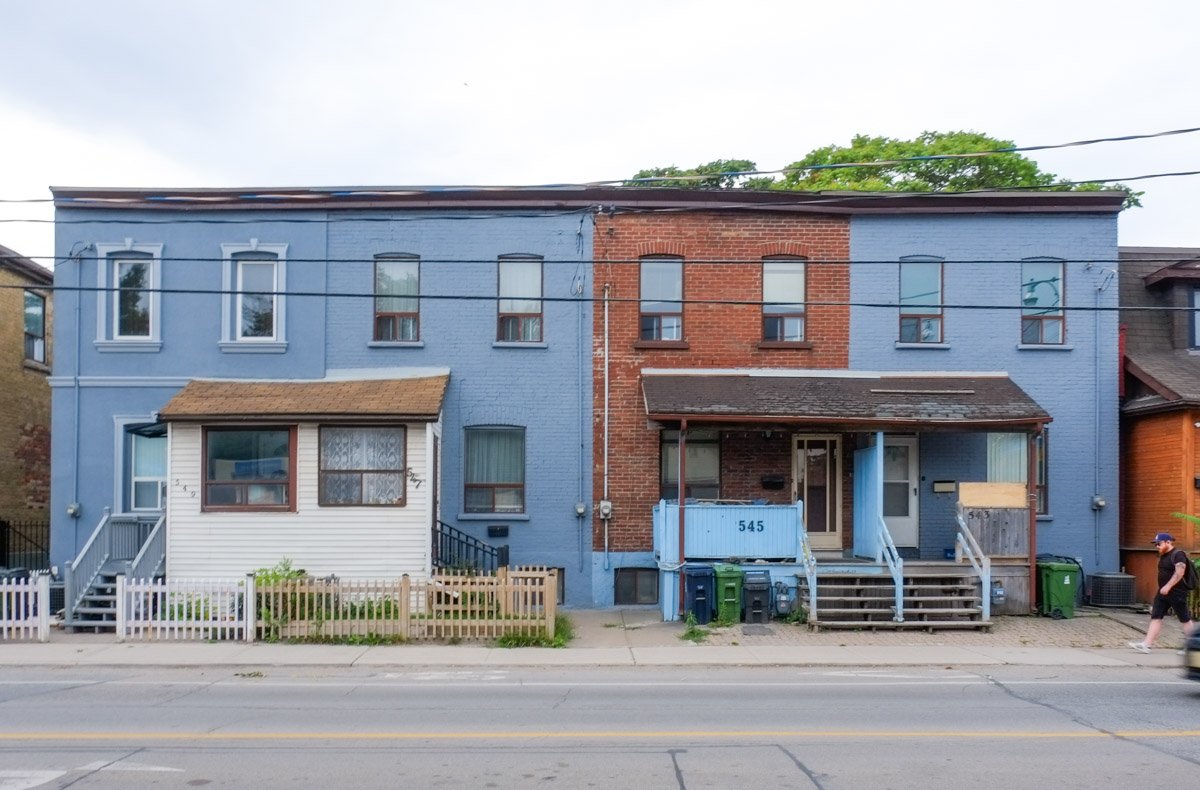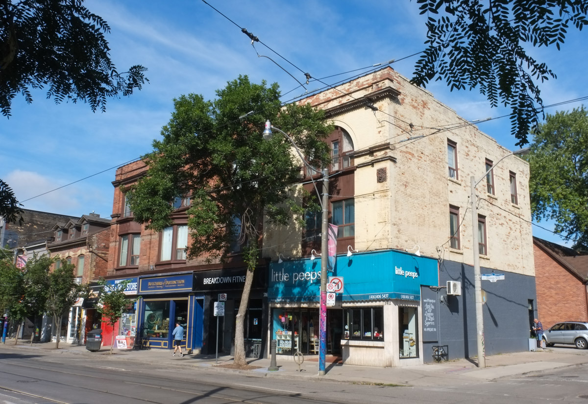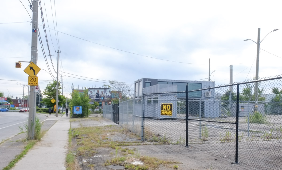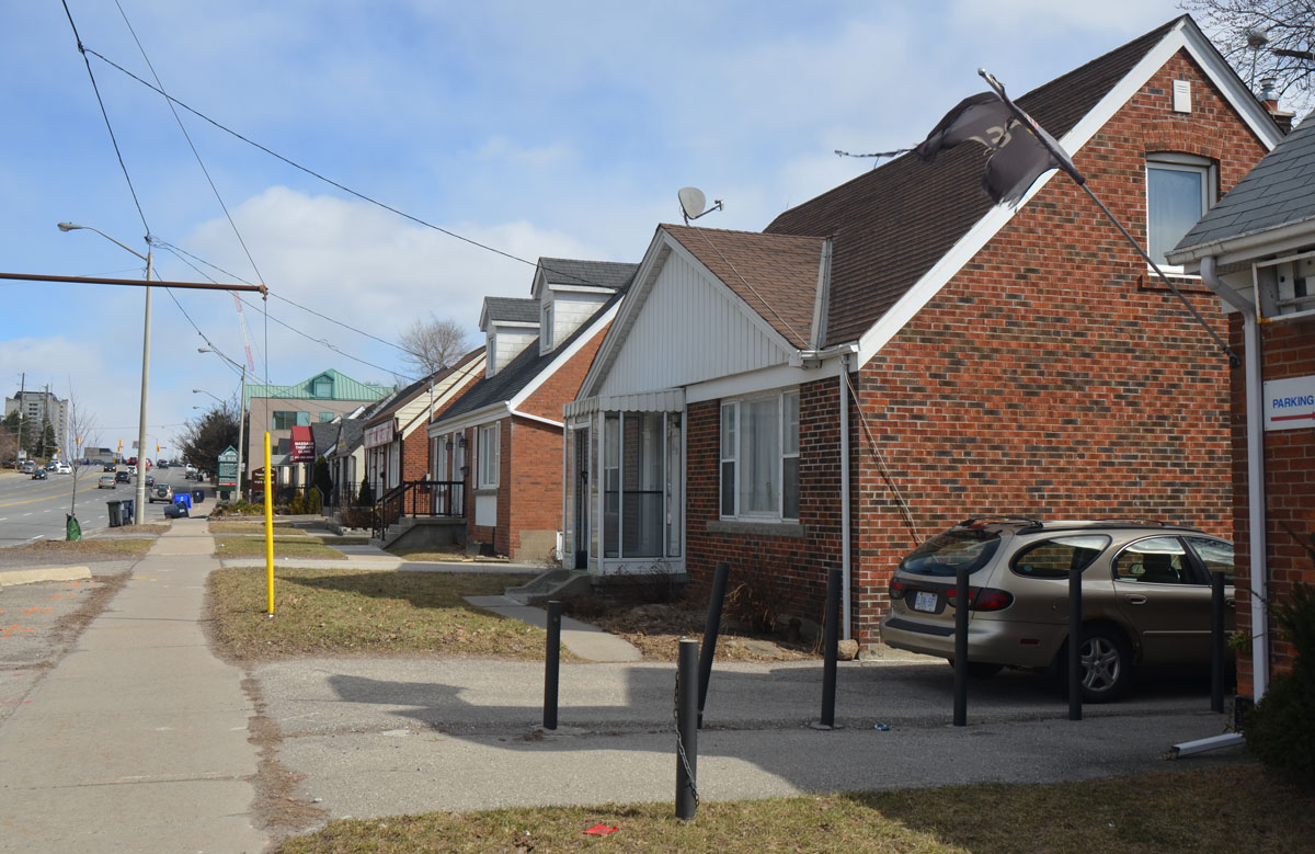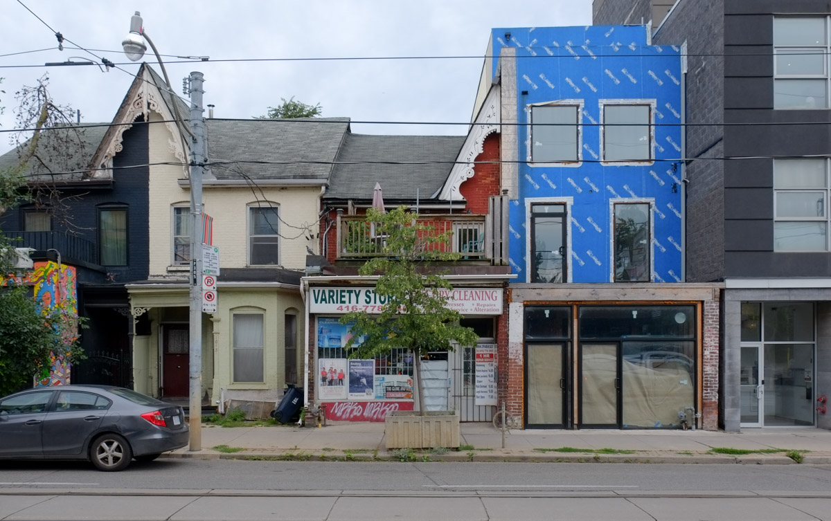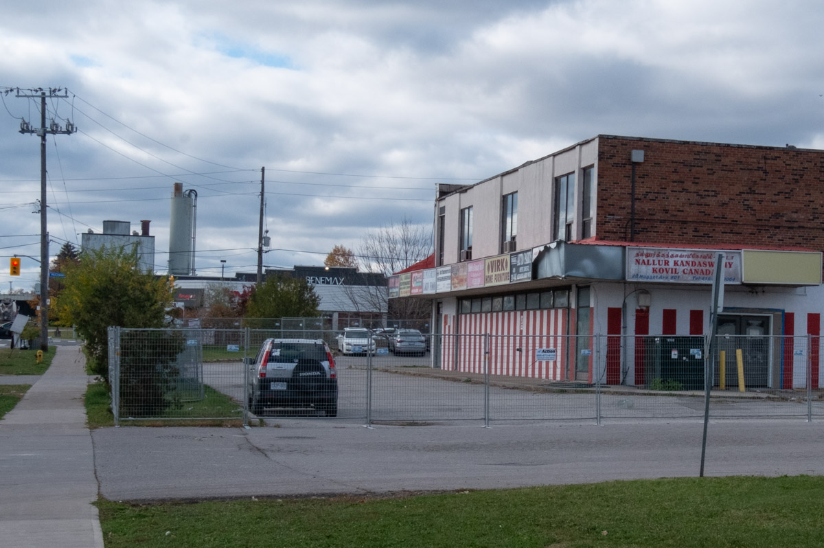 below: Because of the angle from which this photo was taken, the exact locations are slightly unclear. The Medical Clinic is 4651 Sheppard East. To the west of that is a vacant lot that used to be a gas station and it is on the SE corner of McCowan and Sheppard; it is in the process of being redeveloped. The apartment building is actually on the SWt corner of McCowan and Sheppard.