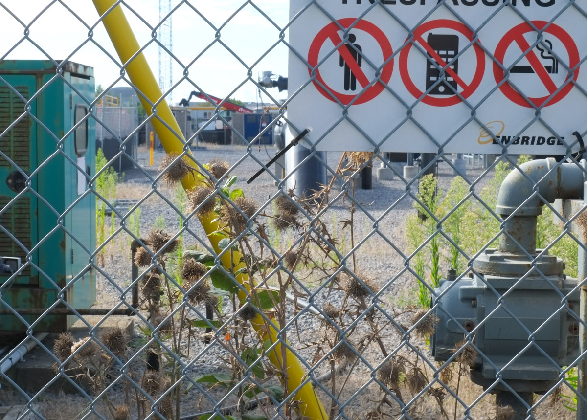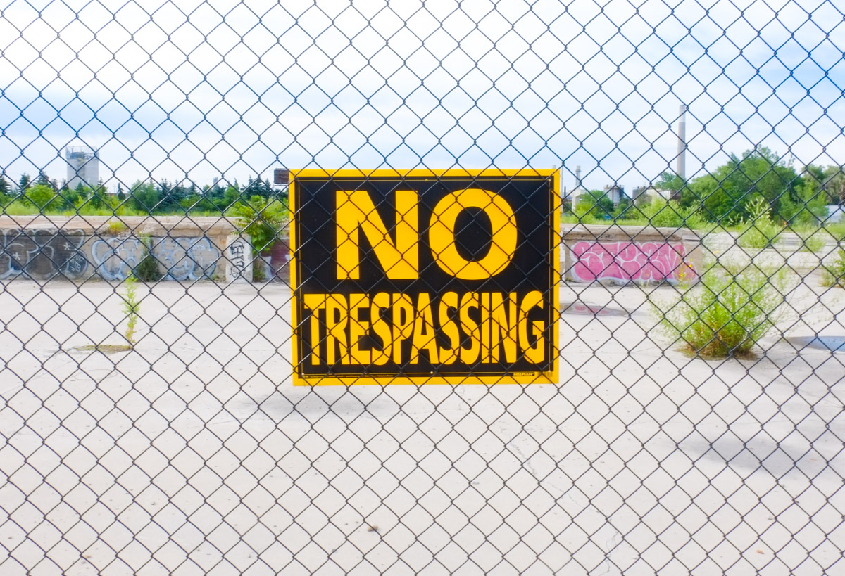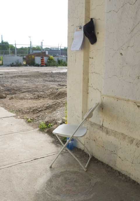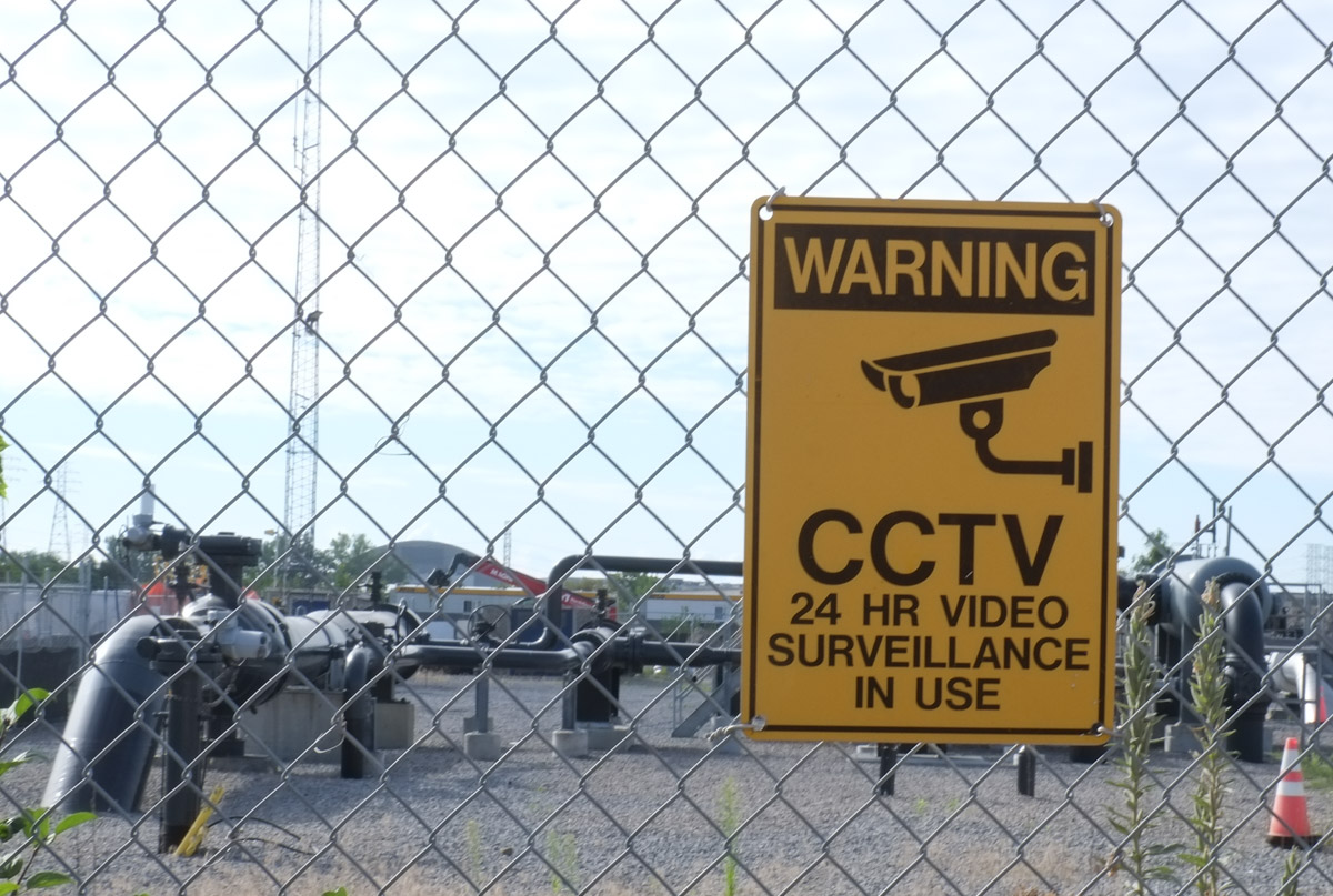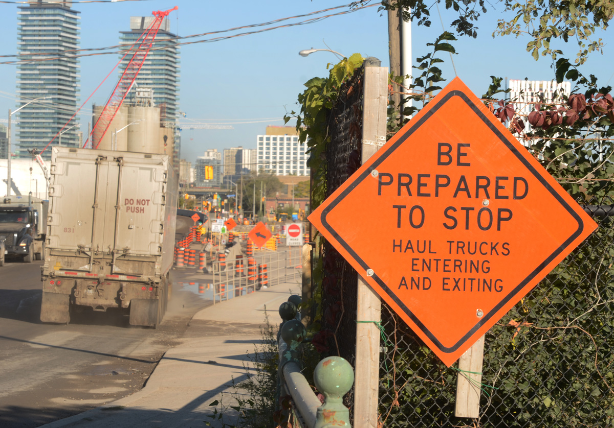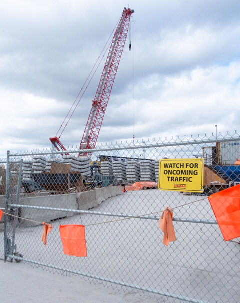below: One of the entrance gates to the Metrolinx construction site. Note all the stacked concrete sections that will form the tunnel walls.