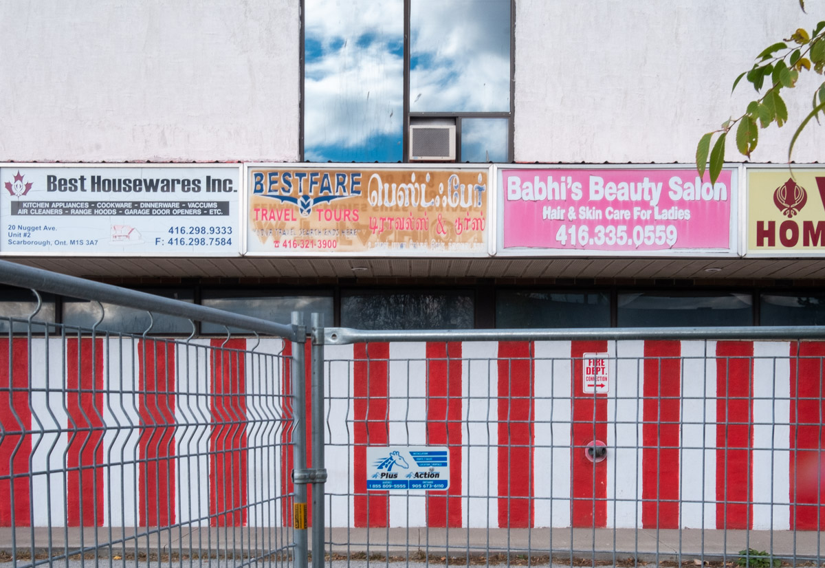below: Nugget Avenue crosses West Highland Creek. The plaza at 20 Nugget Ave, with the red and white stripes, was shut down (bought out) by Metrolinx. Apparently, the two-acre property is needed for an emergency exit and underground tail track for the future Sheppard East Station.