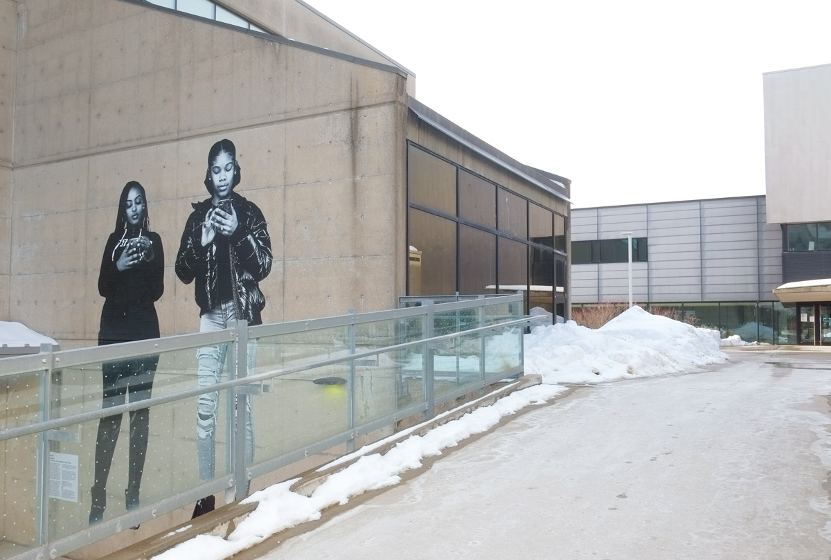below: East side of Highland Hall. The upper level on this side features an aerial image of Scarborough in the mid 1960s when the college first opened.