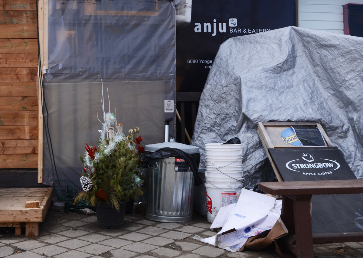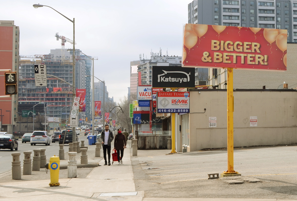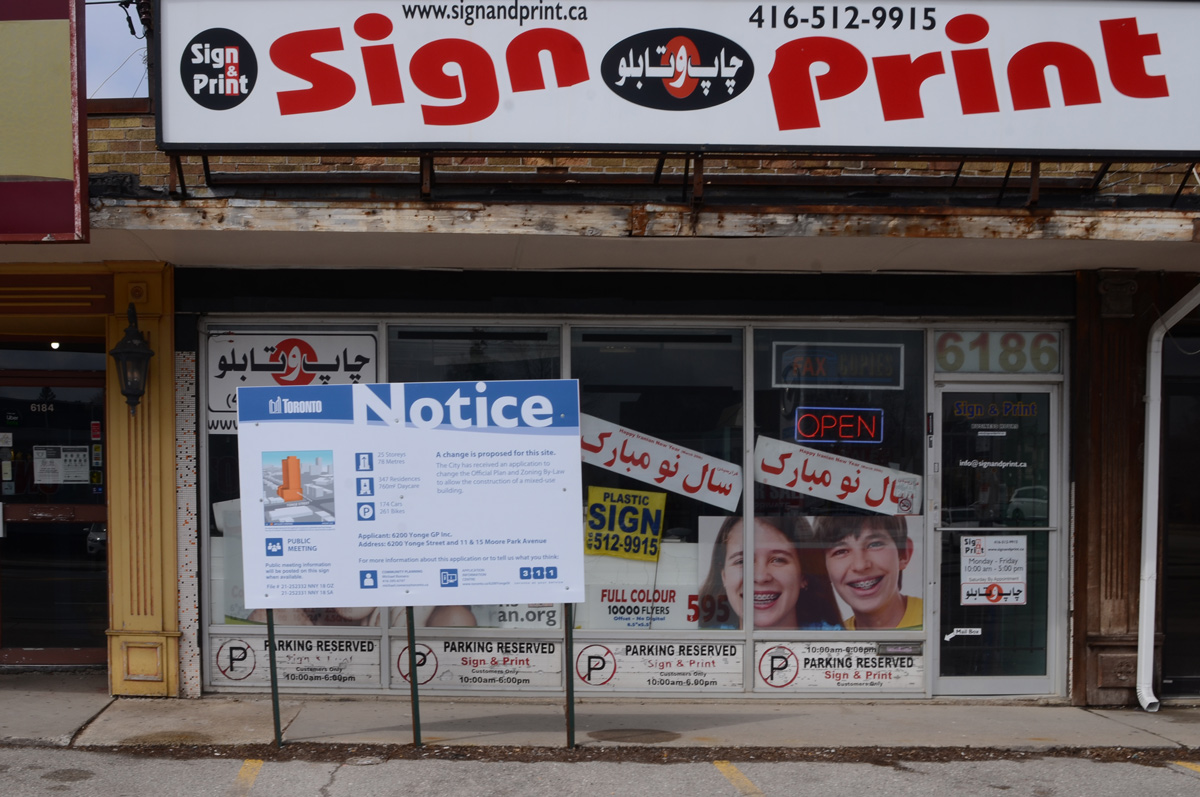 below: Like so many parts of Toronto, there is a lot of redevelopment taking place. Blue and white development notice signs are everywhere.