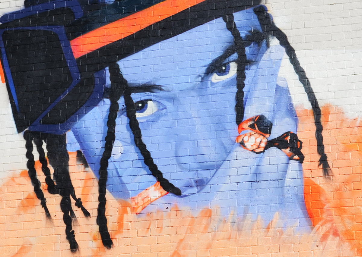 below: The painting of a young woman’s face on the wall of the Cameron House was partially obscured by construction equipment as the work on Queen Street West water pipes continues. I tried to find a way of taking her picture without the obstacles. Pink and flesh tones.