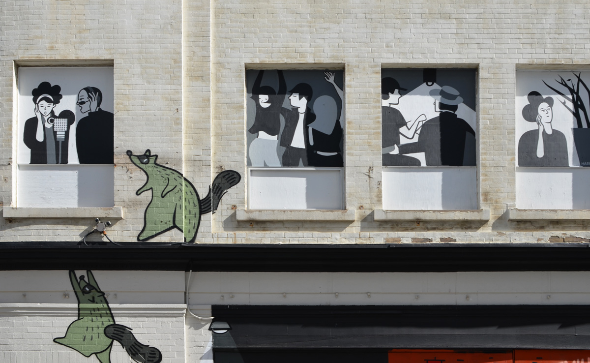 below: I very carefully lined up the picture on the metal box (painted by elicser) with the diamond pattern on the Pizza Pizza wall when along came a streetcar. Photobombed by a streetcar. What is the girl holding? I’ve passed her many times (she’s on the corner of Queen St. West and Spadina) but I’ve never looked closely at her. I always assumed that it was a mug with something hot in it – doesn’t that look like steam? Tonight I realized that it’s a smartphone and that’s not steam, it’s light.