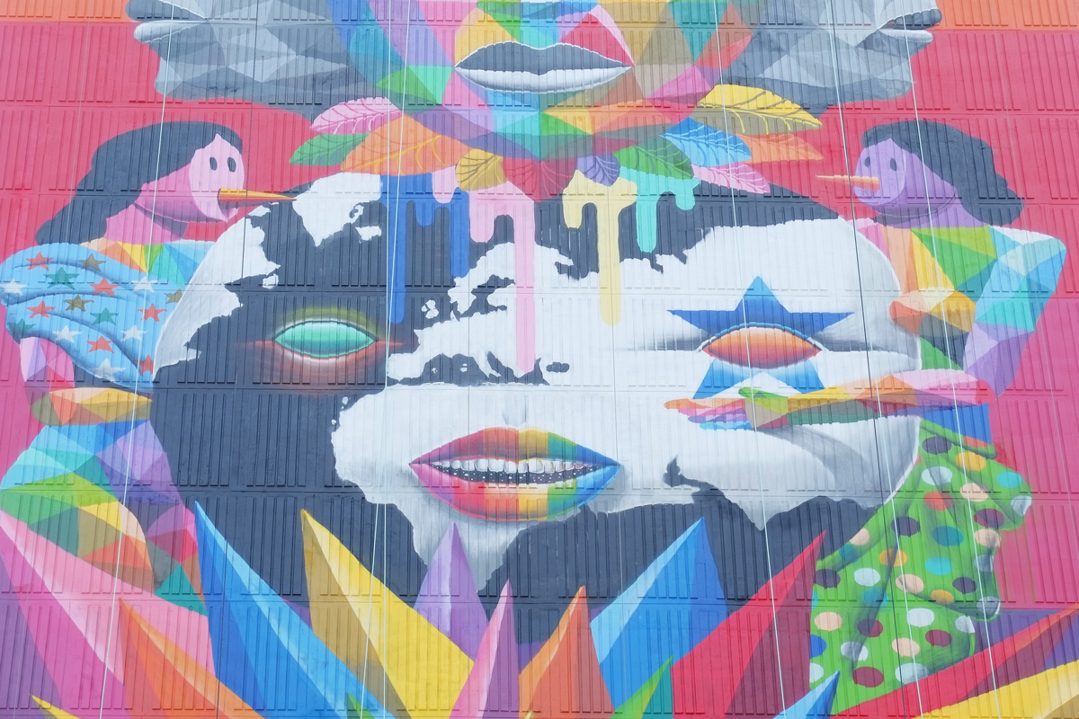 The background of the mural consists of large rainbow coloured stripes on top and black on the bottom. These were painted by local artists before Okudart finished the piece.