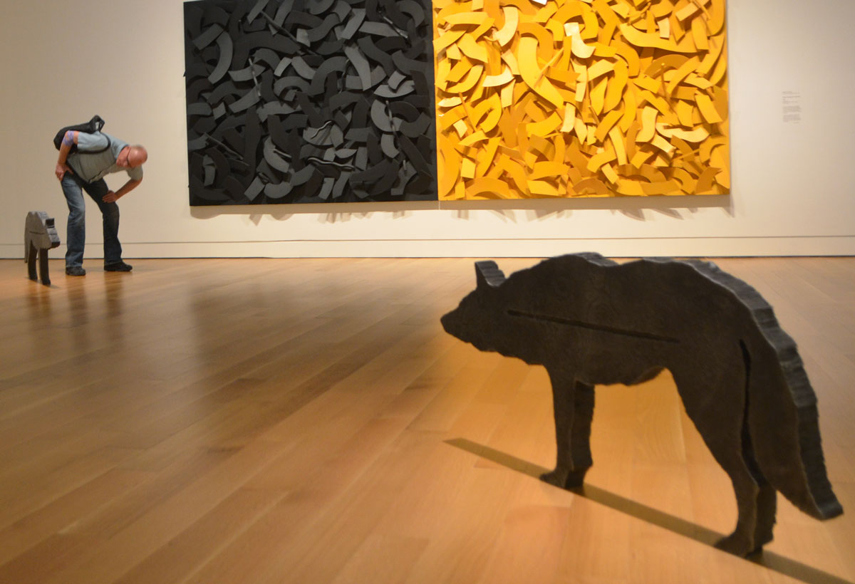 below: ‘The Distinctive Line Between One Subject and Another’ by John McEwen, 1980. Two steel wolves looking at each other across the room. On the wall behind the wolves is ‘Folia Series #1 and #2 by Nobuo Kubota, 1976, representations of the wrinkles on the cerebellum in the brain.