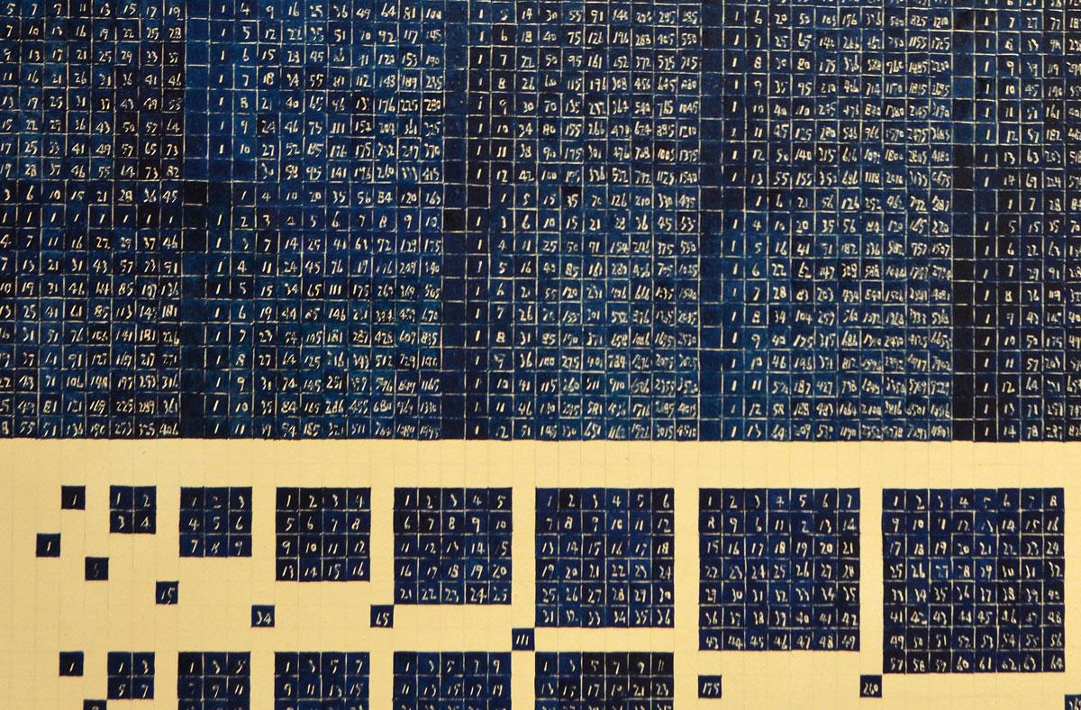 below: A small (maybe 1/8th) section of the painting … which unfortunately doesn’t give you much of an idea as to the composition of the artwork. It does though give you an idea of the detail. Some of the parts that I have omitted are triangle shapes that conform to Pascals triangle as pictured above. Is it mathematics? Is it art? Where do you draw the line between the two? Is there a line?