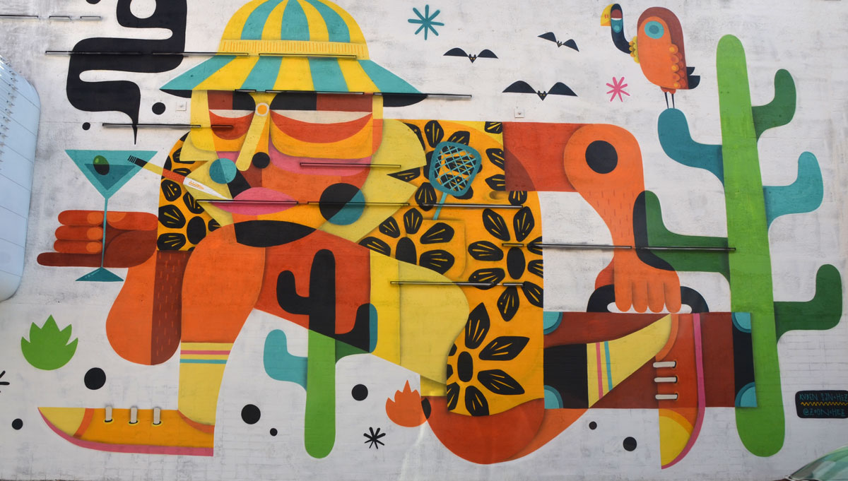 below: An empathetic robot, a Pixel Pancho mural is the one of the murals on the El Cortez.