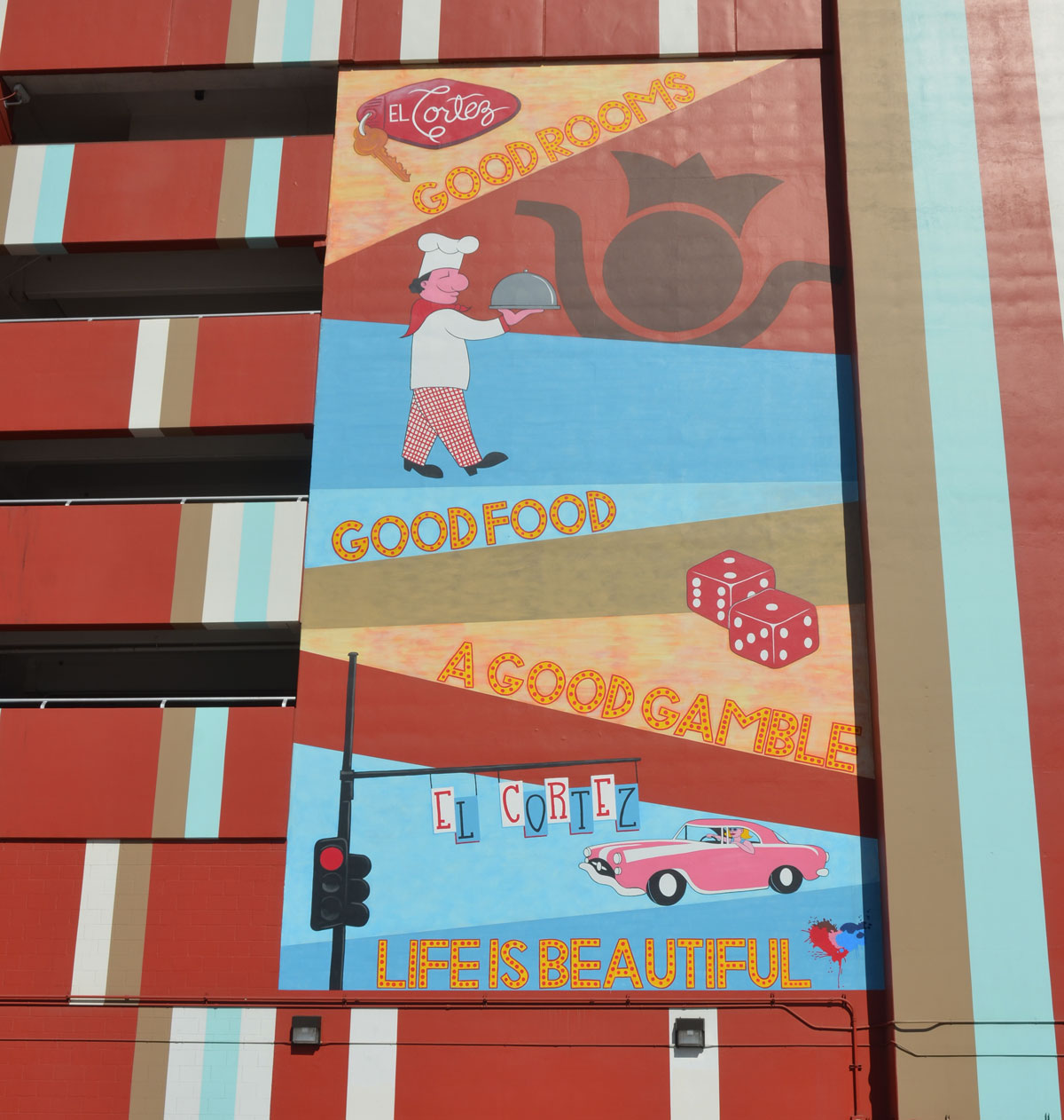 below: The El Cortez hotel parking structure on the corner of 7th and Fremont is now home to two murals, as well as a sign advertising 24/7 prime rib meal for $10.99.