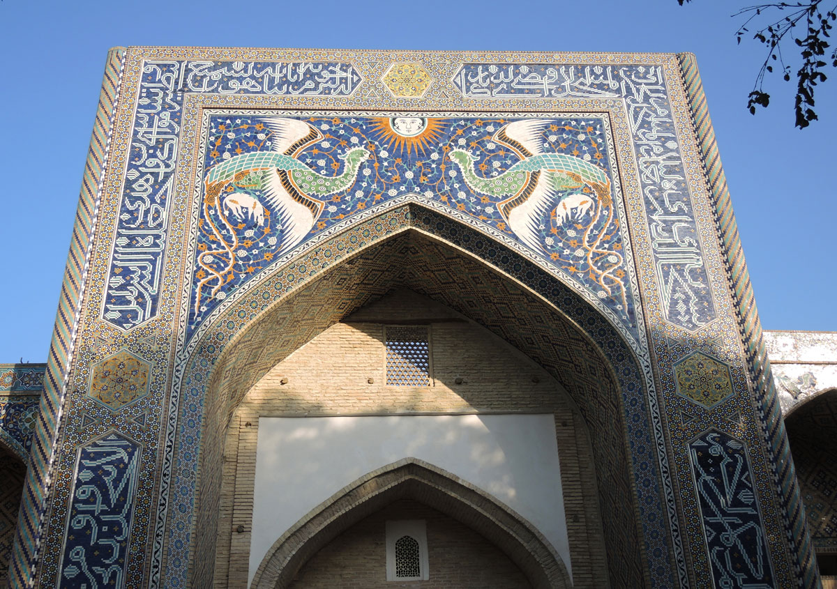 below: The entrance to the Nadir Divan Began Madrasah, first built in 1622.